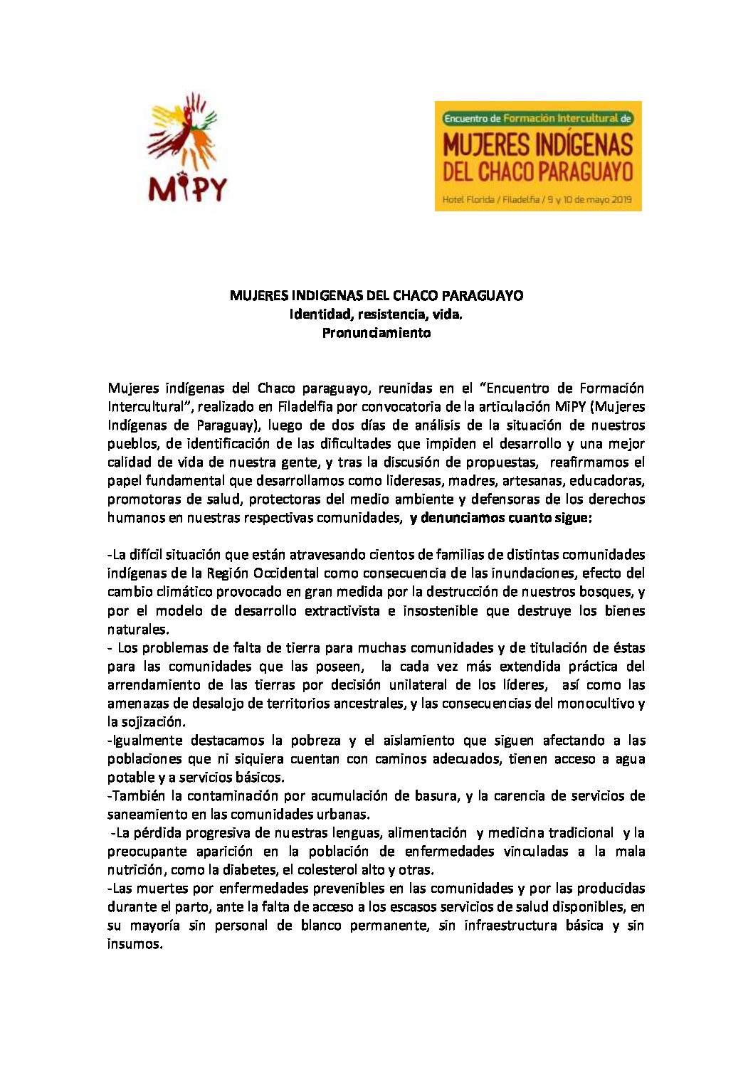 Declaración del Encuentro de Mujeres Indígenas del Chaco Paraguayo Identidad, resistencia, vida.