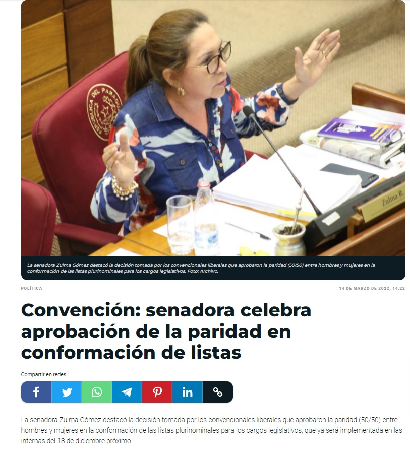 Convención: senadora celebra aprobación de la paridad en conformación de listas