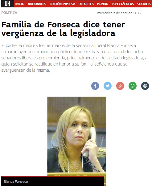 Familia de Fonseca siente “vergüenza” de la senadora y escrachan a Bóbeda