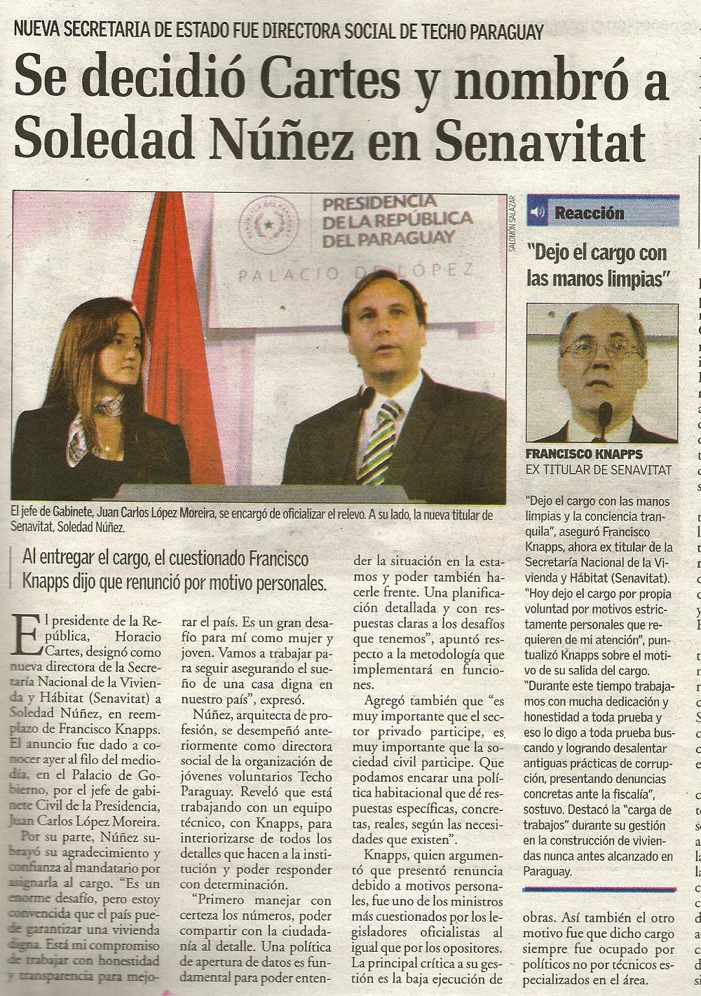 Cartes destituye a Knapps y nombra en Senavitat a activista de una ONG